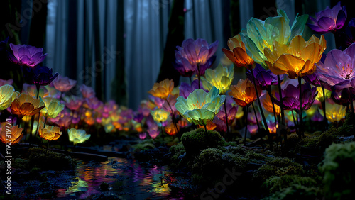 夜の森の中で色鮮やかに発光し並んで咲く幻想的な花々