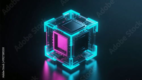 水色とピンクのネオンカラーで発光するサイバー風のデジタルキューブの画像