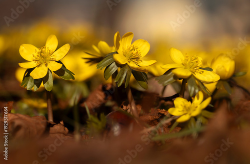Ranniki zimowe (Eranthis hyemalis) kwitnące w lesie na tle suchych liści, zwiastuny wiosny