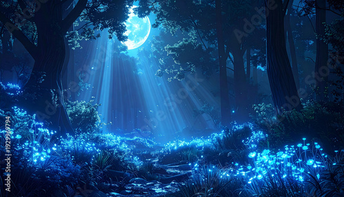 夜の幻想的な森・三日月と青い発光花が広がる道