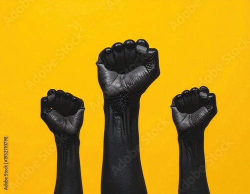 Trzy czarne pięści uniesione w górę na jasnym żółtym tle, symbolizujące siłę, jedność, protest oraz walkę o sprawiedliwość społeczną i równość.