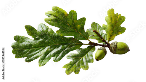 Fresh oak leaves and acorns growing on a healthy green branch in nature