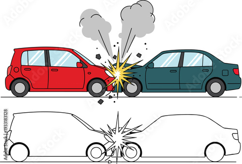 Car accident collision illustration, two vehicles crash impact scene with damage explosion flat vector isolated set