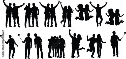Friends group silhouette collection, happy people jumping taking selfie posing together black vector illustration isolated set