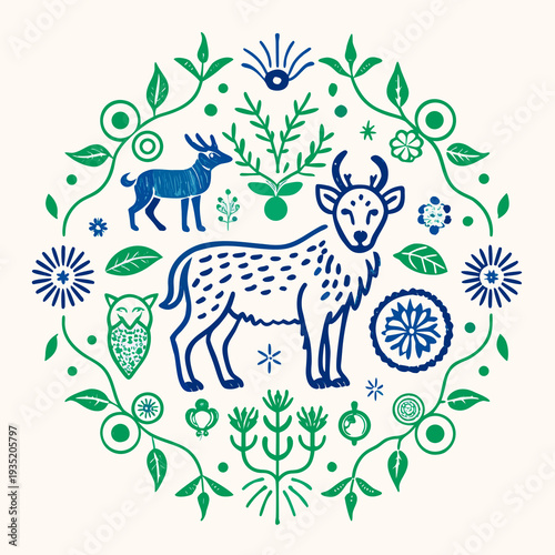 ลายกวางสไตล์พื้นบ้าน โทนน้ำเงิน–เขียว ล้อมด้วยใบไม้และดอกไม้แบบธรรมชาติ,Folk-style deer in blue–green tones, surrounded by natural leaves and flowers