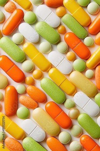 Colorful pills and capsules arranged in a pattern on a white background, creating an abstract wallpaper design