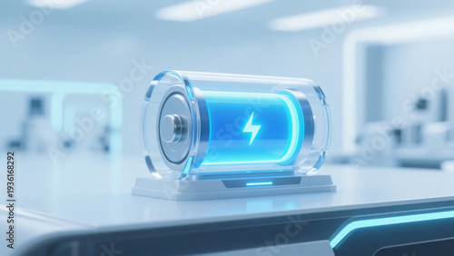 白い実験室のような空間に置かれた雷マークが付いて青く発光する透明なバッテリーの画像