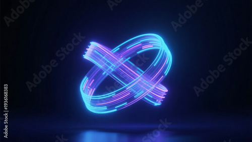 青とピンクのネオンカラーで発光する複数のリングが交差した抽象的なデジタルオブジェクト