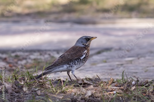Kwiczoł w parku na ziemi wśród suchych liści, ptak z szarym łbem i cętkowanym brzuchem, spacer po trawniku w mieście.