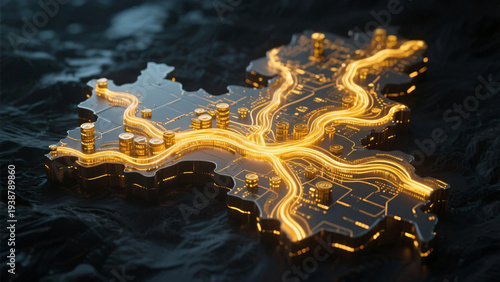 デジタル回路基板のような形状の上にオレンジ色に発光するデータの流れとコインの山が配置された画像