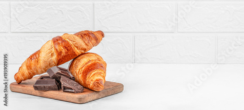 Croissants with Chocolate Pieces on Wooden Board