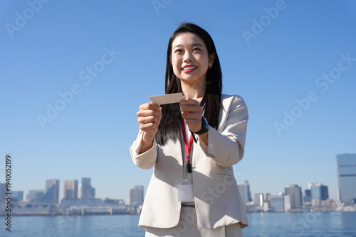 名刺を差し出す若いビジネスウーマン