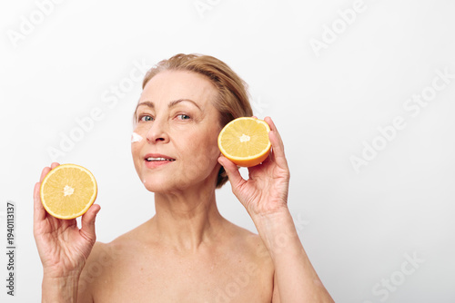 Mature woman with bare shoulders holds two halves of fresh grapefruit near her face. Bright white background highlights healthy skin and natural fruit for wellness and skincare concept.