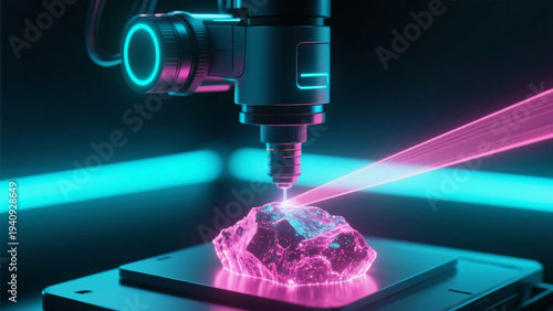 精密なヘッドから放たれるピンク色のレーザーが発光する鉱石を精密加工する様子