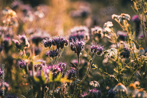 Malownicze pole facelii i rumianku w złotym świetle zachodzącego słońca. Artystyczne ujęcie natury z miękkim bokeh. Idealne na tło, do projektów o ekologii, pszczelarstwie i letnim nastroju.
