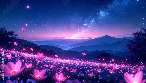 光る蝶と発光する花・ピンクに輝く魔法の花畑と星空の夜