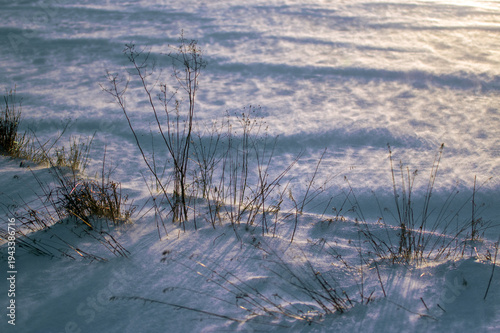 Krajobraz kompozycja zimowa sceneria trawy śnieżny puch, zawieja śnieżna.