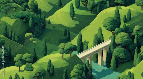 Green rolling hills landscape with stone bridge and river. Vintage engraving style illustration of rural countryside. Textured nature background with trees and viaduct