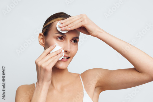 Young woman cleansing face with cotton pads, skincare routine, fresh clean skin, natural beauty, white background, healthy lifestyle, gentle care, closeup portrait
