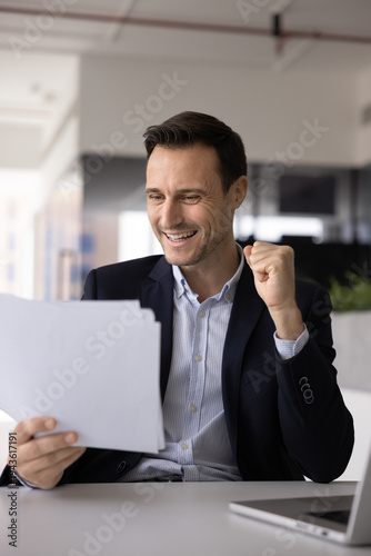 Hispanic corporate executive checking business papers at office workplace excited about successful sales agreement celebrate deal approval lucrative contract terms conditions triumph. Vertical shot