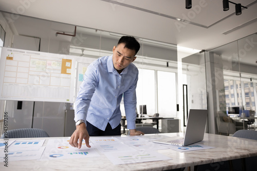 Corporate strategist at work. Concentrated millennial male business analyst financial specialist planning manager engaged in paperwork analyze data trends benchmarking project results using statistics