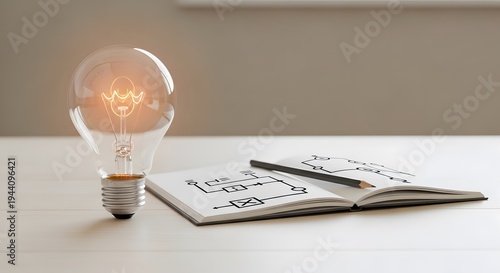 A Light Bulb and an Open Book with a Circuit Diagram on a White Desk