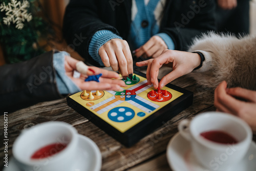 Girls play a colorful board game on a wooden table with tea cups nearby; a warm, casual moment of togetherness.
