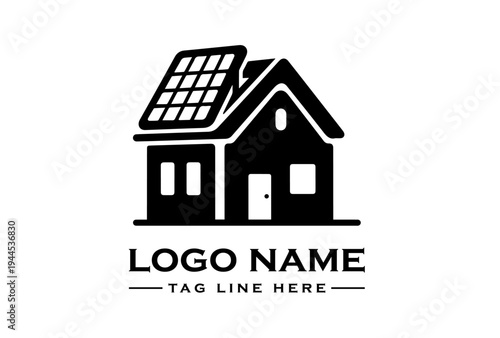 Black silhouette of a house with solar panels on the roof and a placeholder logo text on a white background.