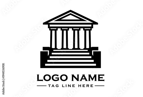 Black and white logo featuring a stylized building with columns and steps on a clean white background.