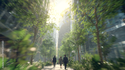 The idea of sustainability in business centers, the sight of businesspeople walking around a corporate office in a green city downtown, abstract motion blur images with blurred backgrounds, and genera