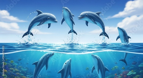 Dolphins jumping in ocean illustration