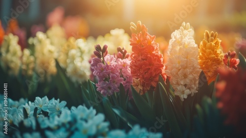 Radiant blooms: A vibrant display of colorful hyacinths bathed in soft light