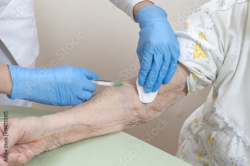 Pielęgniarka w rękawiczkach jednorazowych dezynfekuje miejsce na ręce starej kobiety przed pobraniem krwi.