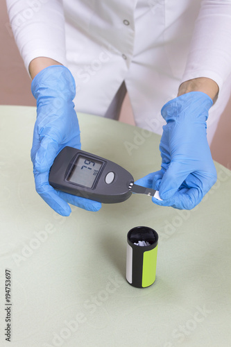 Ręka w rękawiczce jednorazowej wyciąga pasek do mierzenia poziomu cukru we krwi glukometrem z pudełka. Glukometr leży na stole.