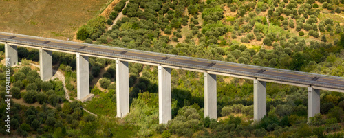 Aerial close up of a long and empty concrete viaduct bridge stretching across a lush green valley. The modern engineering structure stands in stark contrast to the dense Mediterranean vegetation below