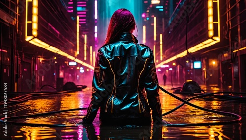 Back view of a female operative in wet leather jacket standing in a flooded cyberpunk city at night, vibrant neon reflections on water surface, futuristic urban environment, 8k, photorealistic, genera