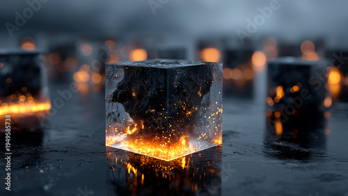 オレンジ色に発光するキューブの抽象空間