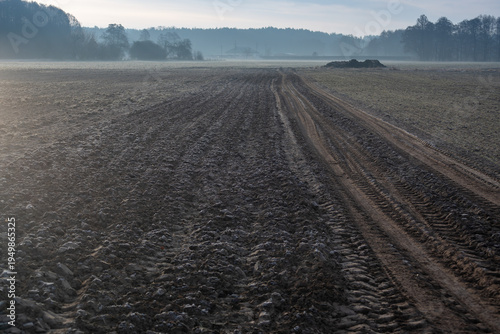 Zaorane pole z charakterystyczną ziemią - typowy wczesnowiosenny wiejski krajobraz