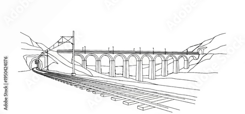 Black and white sketch of train tracks leading to a tunnel and viaduct