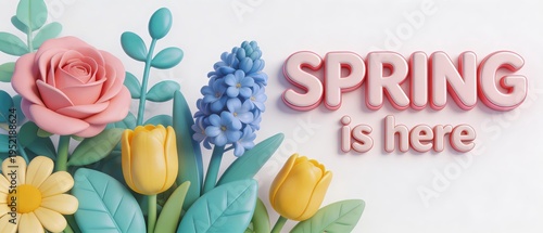 3D render of colorful spring flowers including rose, tulip, hyacinth, and daisy with leaves. Text 'Spring is here' in bold letters. Stylized illustration with white background.
