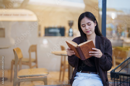 Young asian woman deeply engrossed in reading a traditional hardback book, thoughtfully absorbing content while relaxing outdoors in a cafe environment, promoting literacy and knowledge
