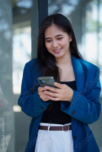 Young Asian businesswoman smiling brightly and looking at her smartphone, communicating and staying connected with technology in a modern outdoor setting while wearing a blue blazer