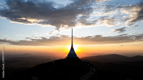 At dusk, Jested Mountain Hotel stands beautifully against a vibrant sky over Liberec. The modern architecture is highlighted as the sun sets, casting warm hues across the landscape.