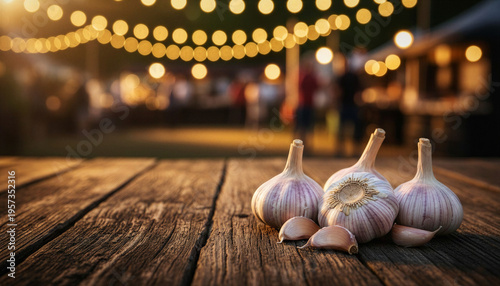 A close-up of several organic garlic bulbs on a weathered wooden table. The background features blurred, glowing fairy lights in a warm, festive atmosphere.