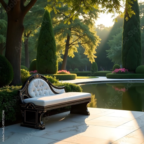 Elegant Garden Bench by Tranquil Pond at Sunset, Lush Landscape and Serene Outdoor Scene