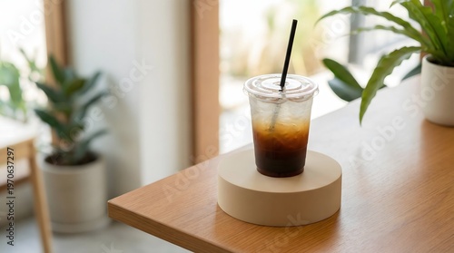 Iced americano presented on a modern podium with soft shadows and studio lighting, perfect for commercial beverage branding.