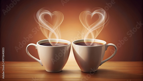 Two coffee cups with steam forming hearts on wood background