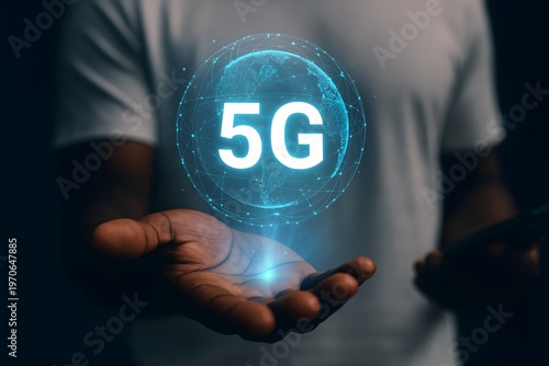 An unrecognizable person holding their hand out, showcasing a glowing blue ai assistant hologram with various digital icons for interaction and services.