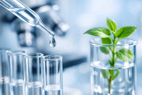 Clear glass dropper releasing a single water drop into a test tube next to a vibrant green plant for scientific research and ecological study.