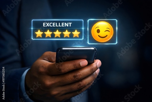Hand is holding a smartphone prominently displaying an "excellent" rating with five glowing stars and a cheerful winking emoji, indicating top-tier customer satisfaction and service quality.